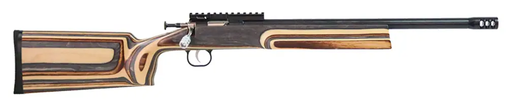 Crickett's XBR rifle features a birch stock with knurled grooved handle and slotted muzzle break. Th