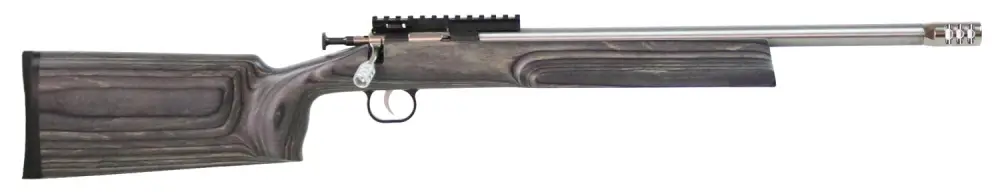 Crickett's XBR rifle features black laminate wood stock with a knurled grooved handle and slotted muzzle break.
