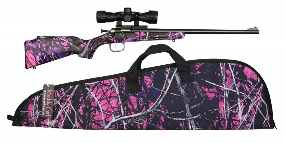 This model features a blued barrel and a Muddy Girl camo stock. It comes with a scope, mount and designer gun case.