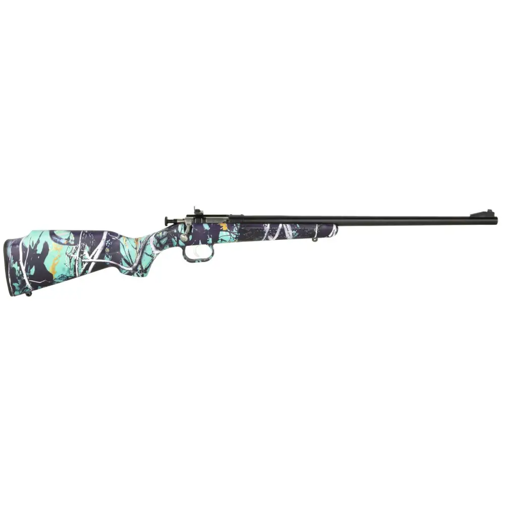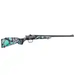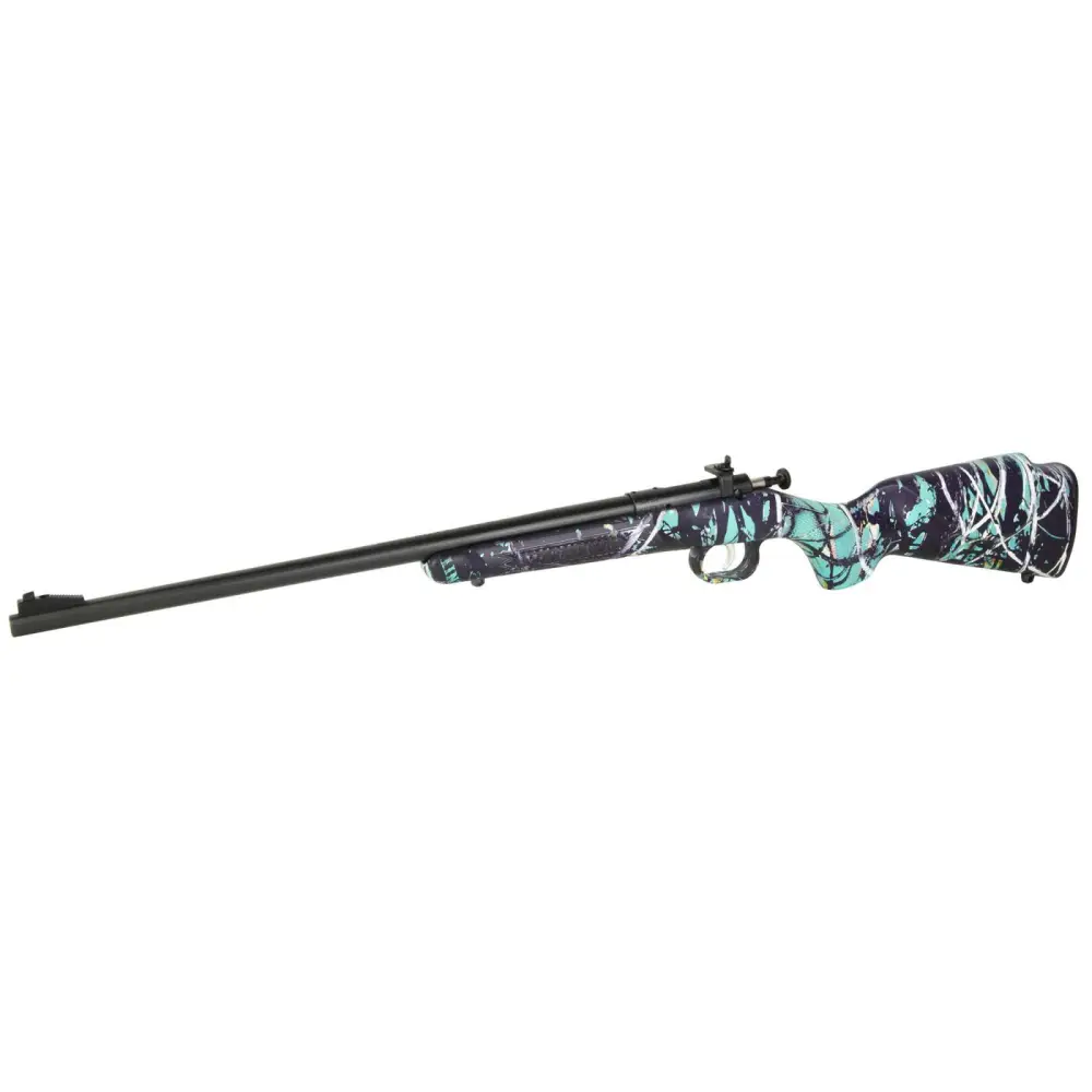 Crickett's Single Shot 22 LR rifle features a Muddy Girl Serenity synthetic stock, an adjustable rear/fixed front sights, and a bolt action constructed from alloy nickel plated steel.