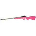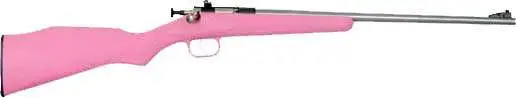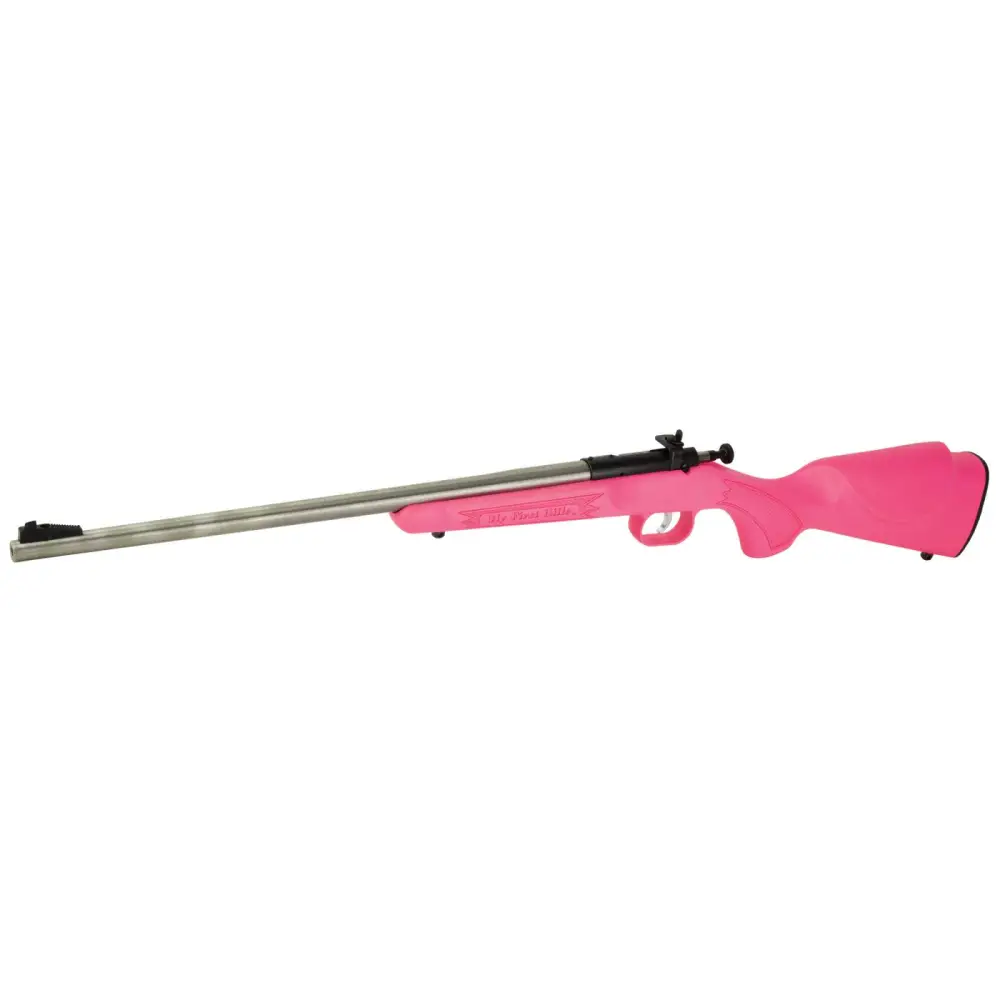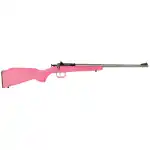 Crickett's Single Shot 22 LR rifle features a pink synthetic stock, adjustable rear sight, and a bolt action constructed from alloy nickel plated steel.