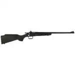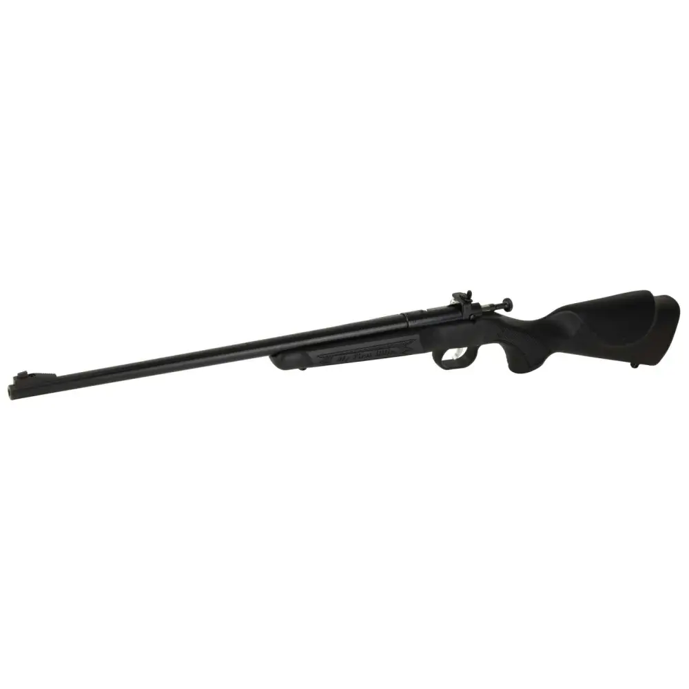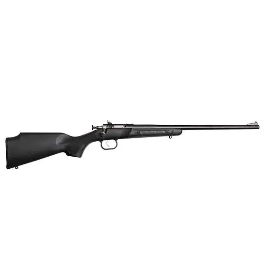Crickett's Single Shot 22 WMR rifle features a black synthetic stock, adjustable rear sight, and a bolt action constructed from alloy nickel plated steel.