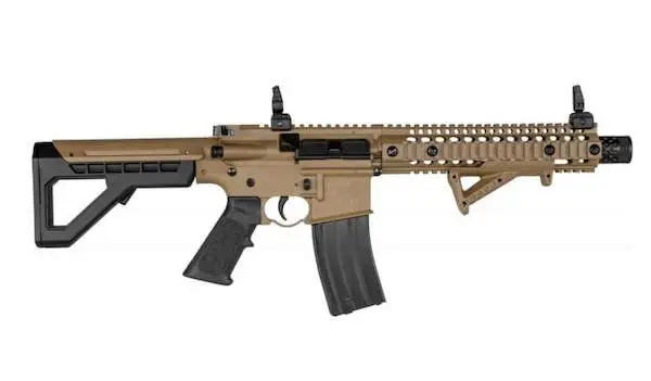 The DPMS SBR air rifle is a Full Auto replica that shoots CO2 powered BB's. It features a smooth bore steel barrel, adjustable stock, flip-up sights, and a picatinny rail to attach accessories.