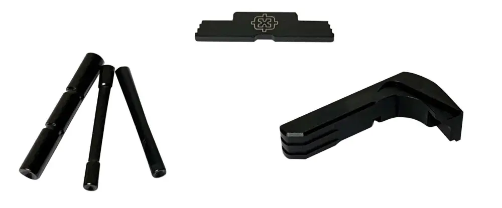 Cross Armory Glock 3 Piece Kit contains Dimpled Pin Set, Extended Magazine Catch and Extended Slide Lock. The Slide Lock and Pin Set is made of 4140 Steel, the Magazine Catch is made of Aluminum. Does not intefere with gun holster. Fits Glock Gen5 17, 19, 26, 34.