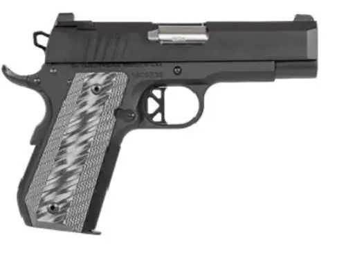 Bringing the heavy, match-grade barrel from our Officer-size ECO to a bit bigger platform, the Enhanced Commander Pistol 45A is a 4" gun that conceals well but is a tack-driver at the range. With a compact, stainless steel slide and a forged aluminum frame, weight is kept to a svelte 29 oz. Our new tapered G10 grips and a bobtailed frame enhance its ergonomics, affording shooters with smaller hands an easier reach to the trigger. A tri-topped slide wears aggressive side serrations and a top rib to knock down glare, while our new U-notch rear sight is matched to our brass-beaded front sight. The bull barrel itself is flush-cut to make for easier disassembly and has a 30 degree crown. With a similar recoil system to the ECO, it has a flat wire recoil spring that is rated for 15,000 rounds, three times the round count of a typical 1911 dual recoil spring setup.