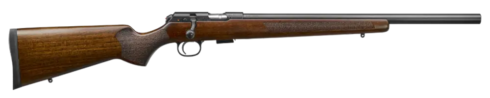 The standard heavy-barreled version of the 457, the Varmint has a .866" cylindrical barrel. Not only does the heavy barrel make for good harmonics, it also allows the Varmint to perform well with a wide variety of rimfire loads, translating into an accurate platform for shooting targets or getting game. The Turkish walnut stock has an American-style comb for use with a scope and a wide, flat forend that rides a sandbag well. Laser-cut stippling gives grip fore and aft. In addition to the receiver-mounted, push-to-fire safety, we chopped almost an inch of length from the action and slab-sided it to reduce its footprint and weight. It has the exact same swappable barrel system as the 455 and the same reliable polymer magazine system.