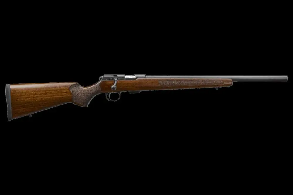 The standard heavy-barreled version of the 457, the Varmint has a .866" cylindrical barrel. Not only does the heavy barrel make for good harmonics, it also allows the Varmint to perform well with a wide variety of rimfire loads, translating into an accurate platform for shooting targets or getting game. The Turkish walnut stock has an American-style comb for use with a scope and a wide, flat forend that rides a sandbag well. Laser-cut stippling gives grip fore and aft. In addition to the receiver-mounted, push-to-fire safety, we chopped almost an inch of length from the action and slab-sided it to reduce its footprint and weight. It has the exact same swappable barrel system as the 455 and the same reliable polymer magazine system.
