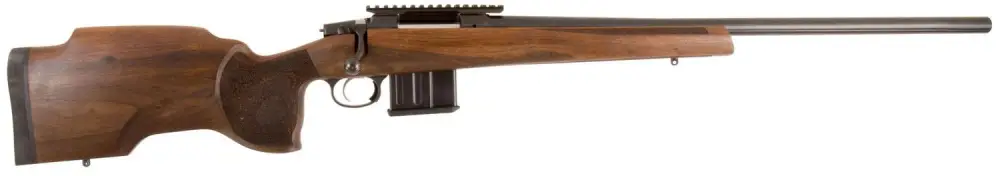 Building on the incredibly precise 557 short action, the Varmint model adds a stout 25.6" barrel in a heavy profile that tapers to a 0.863" muzzle. Anchored in a walnut stock, it has a healthy palm swell, laser-cut stippling, and a flat forend. With ergonomics as the guiding principle in the stock's development, the result is an incredibly comfortable rifle to lay behind, whether you're punching paper, ringing steel, or knocking off prairie dogs at great distances. CZ's 557 Varmint has a fully adjustable trigger, 14.5" LOP, and integral 19mm dovetails.