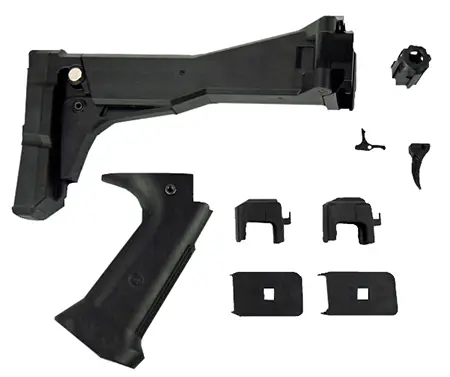 This Evo kit features a factory folding stock, muzzle break, disconnector, trigger face, pistol grip, two magazine followers, and two magazine plates.