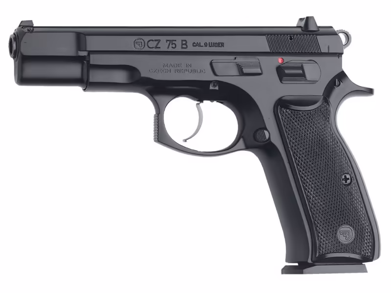 The CZ 75 is the flagship model of the CZ handgun line. The CZ-75B features the short recoil, tilt barrel with radial locking lugs. Characteristic features of all versions include: all steel construction, fixed sights, a double column magazine, and slide stays open after last cartridge has been fired. The 'B' designation is an indicator that the model is equipped with a firing pin block safety. The CZ 75 B SA (single action) is identical to the CZ 75 B in all aspects except that it has a single action trigger mechanism and a drop-free magazine.