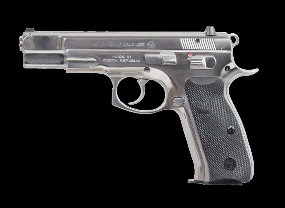The CZ 75 is the flagship model of the CZ handgun line. The CZ-75B features the short recoil, tilt barrel with radial locking lugs. Characteristic features of all versions include: all steel construction, fixed sights, a double column magazine, and slide stays open after last cartridge has been fired. The 'B' designation is an indicator that the model is equipped with a firing pin block safety. The CZ 75 B SA (single action) is identical to the CZ 75 B in all aspects except that it has a single action trigger mechanism and a drop-free magazine.