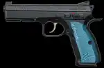 CZ's SP-01 Shadow has taken the competition circuit by storm. It features a higher beavertail, undercut trigger guard, and contoured slide. The Shadow 2 model has a swappable mag release with an adjustable, extended button with three settings. A hardy nitride coating covers the entire pistol, while the frame gets an additional layer of CZ's black Polycoat finish. Its aluminum grips has checkering to match the fine front and backstrap checkering. The slide also has a front fiber optic with a black HAJO rear. This model has a 4.8" barrel, blue grip, and ambidextrous safety.