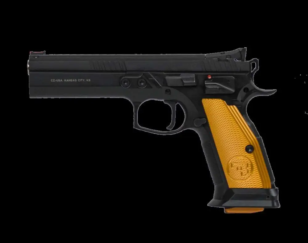 The Tactical Sport Orange borrows a number of design features from the Czechmate and incorporates a few of its own. This pistol features a slimmer trigger guard, revised grip geometry and finer checkering, and it adds a thumb stop and fully-adjustable target sights.