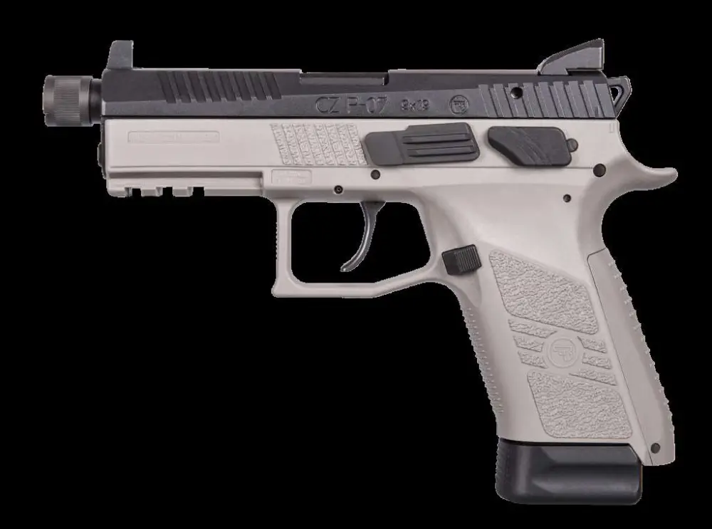This CZ Urban Grey Suppressor-Ready full size pistol features a threaded barrel, high suppressor sight with tritium lamp, and extended capacity magazine. It comes with interchangeable backstraps, nitrated slide finish, and safety and decocker that are interchangeable with a few minutes and minimal tools. Included is a integrated 1913 Picatinny rail on the dust cover. The P-07 is adaptable to the shooter and their needs, from service pistol to bedside protector to the envy of the shooting range.