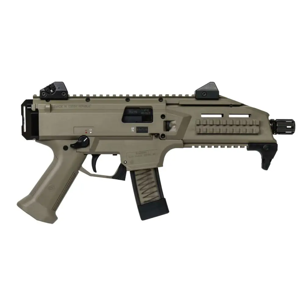 This CZ Scorpion sub-gun is a blowback-operated semi-auto in 9mm with a 7.75" cold hammer-forged barrel. Its muzzle features 1/2x28 threads hidden underneath the factory flash hider, meaning users can fit either 1/2x28 or 18x1 accessories to the muzzle. Equipped with low-profile sights, its rear sight has four different aperture sizes for everything from close quarters to way out there. The sights ride on an 11" Picatinny rail perfect for mounting optics. It has a polymer frame with a QD sling swivel pocket integrated into the rear sling attachment point. Simple and reliable, the Scorpion not only has ambidextrous controls, its non-reciprocating charging handle is swappable and trigger reach is adjustable. This FDE model has a 20-round magazine.