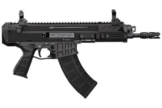 The Bren 2 Ms makes first landfall in the US in pistol form with multiple barrel lengths and two chamberings. With a trimmed-down aluminum receiver and a lower made from carbon fiber-reinforced polymer, the result is a robust but substantially lighter gun. Gone is the reciprocating charging handle, replaced with one that stays stowed in the forward position until it is needed. Swappable from side to side, it does double duty as a forward assist. Also added is an AR-style bolt catch/release system that is mirrored on both sides of the firearm, as well as a catch/release nestled into the front of the trigger guard. The magazine release and safety are ambidextrous. In pistol form, the Bren 2 Ms comes with a flush rear plate that has the provision for attaching a AR-style buffer tube for the installation of an arm brace, cheek rest, or similar pistol stabilizing device. AR-15 style magazines are used for 223 variants; all variants are swappable to different barrel lengths and chamberings and also feature a modular forend that can be swapped to different lengths.