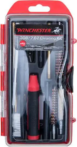 This Winchester 17 piece AR 308/7.62 gun cleaning kit Includes: Red Winchester case, hybrid multi-function handle, 33" pull rod, 2 brass rods for attaching the breech brush to handle, .30 cal. rifle brush, mop, slot tip, .308 cal. breach brush, one double-ended metal pick/scraper, double-ended nylon utility brush to clean parts and a 1/4" punch pin, 25 patches, 6 piece bit set (3 star (T10/ T15/T20), 2 hex (3/32" and 7/64"), one flat head (3/32").