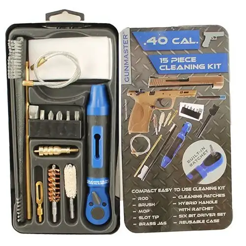 This 15 piece cleaning kit includes: Rod, Brush, Mop, Slot Tip, Brass Jag, Cleaning Patches, Hybrid Handle with Ratchet, Six Bit Driver Set, and a Reusable Case. This model is for 40 caliber firearms.