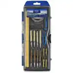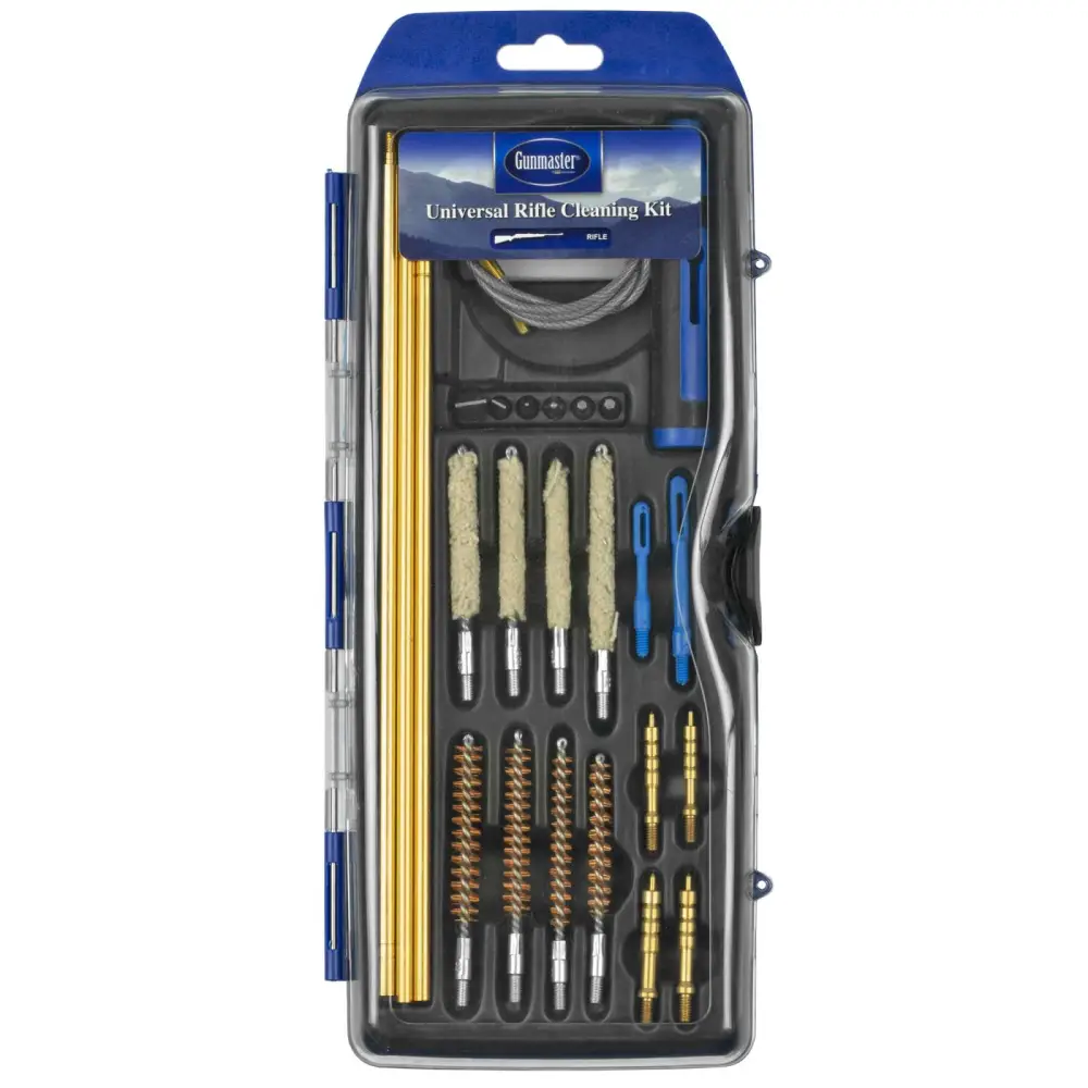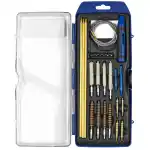 This Universal Hybrid Rifle cleaning kit has a multi-function handle, rods and 33 pull rod and 6 piece driver set. It can be used to clean .22 cal. and larger bore rifles. This kit includes hybrid multi-function handle, 3 piece rod, 33 pull rod, .22, .243, .270/.280 and .30 cal. rifle brushes and mops, .22, .243, .270/.280 and .30 cal. jags, .22 and .30 cal.slot tips, 25 cleaning patches and 6 piece bit set. It accepts standard threaded bore brushes and mops for cleaning .22 cal. and larger bore rifles.