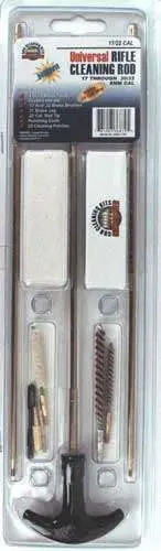 DAC Technologies 7-piece universal .17 to .22 caliber rifle & pistol cleaning kit features: three solid brass rods (.17cal. diameter), one .17 cal wire brush, one .17 cal mop, one .22 cal wire brush. Its durable clamshell packaging can be used for storage when the kit is not in use.