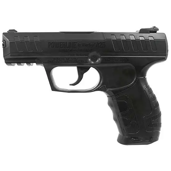 This Powerline air pistol features a blade and ramp front/fixed front sights and is powered by CO2.