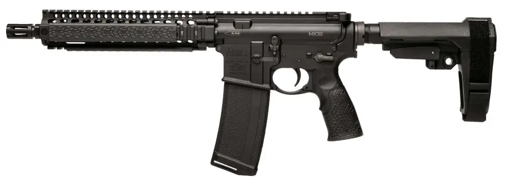 Daniel Defense's MK18 Pistol is a variation of the MK18 SBR. It is equipped with a SB-Tactical SOB Pistol Stabilizing Brace and a Daniel Defense pistol grip with an integral trigger guard and soft touch overmolding. The direct impingement, carbine length, low profile gas block is CNC machined from 4140 hardened steel with a Mil-Spec heavy phosphate coating. Its 10.3" barrel is constructed of chrome moly vanadium steel that is chrome lined with a heavy phosphate coating and a nitride finished flash suppressor. The Mil-Spec upper and lower receivers are CNC machined of 7075-T6 aluminum, with a hard coat anodized finish. The MK18 pistol's handguard is also CNC machined from 6061-T6 aluminum, with a hard coat anodized finish and rail panels made from heat resistant Santoprene. This model has a black forend.