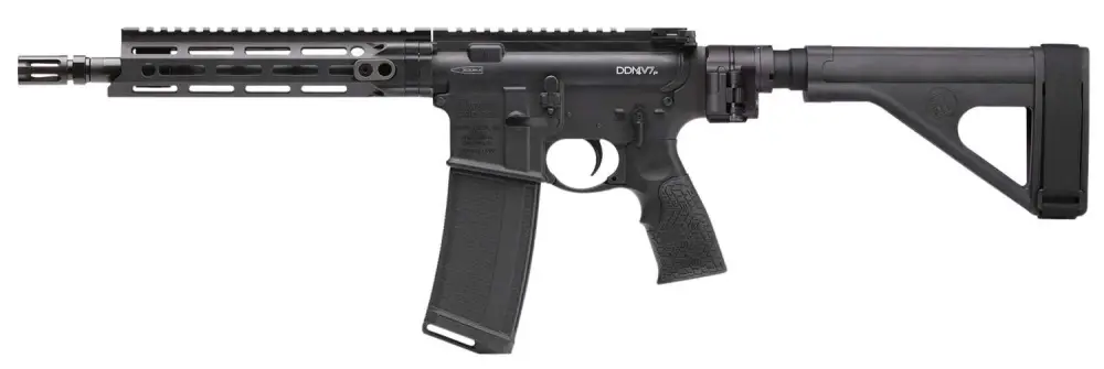 Daniel Defense's DDM4 V7 pistol is a variation of the DDM4V7 S. It features a SB Tactical SOB pistol stabilizing brace, M-Lok attachment technology and comes equipped with a rugged and comfortable Daniel Defense pistol grip with integral trigger guard and soft touch overmolding. The direct impingement, low profile gas block is CNC machined from 4140 hardened steel with Mil-Spec heavy phosphate coating. The upper and lower receiver is CNC Machined of 7075-T6 Aluminum with a hard coat anodized finish and AR pistol receiver extension. The lower receiver has an enhanced flared magazine well and QD swivel attachment point. The DDM4 V7 also has a Vanadium steel, chrome lined, barrel with a Mil-Spec heavy phosphate coating and flash suppressor, and a 9.0 M-Lok CNC machined 6061-T6 aluminum handguard. This 300 Blackout model has a black finish and a Law Tactical Gen3-M AR folding stock adapter.