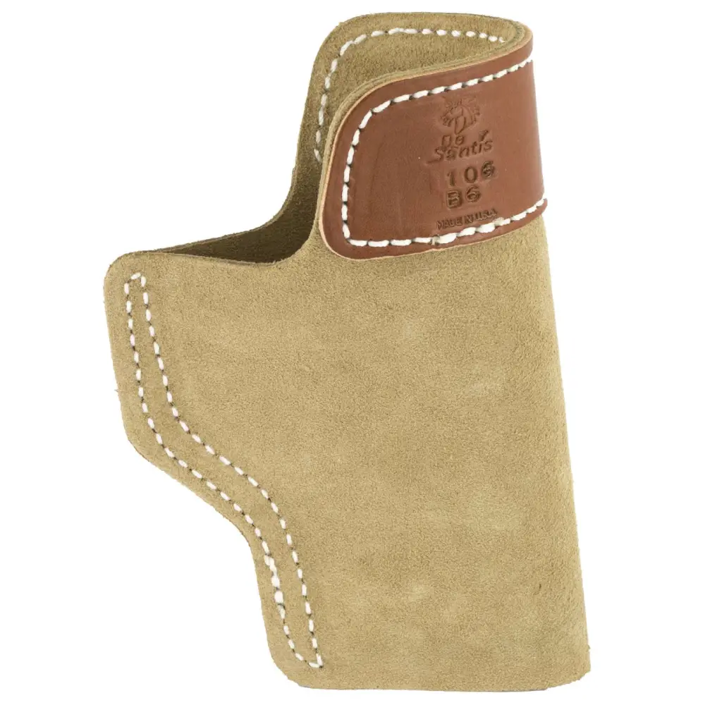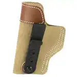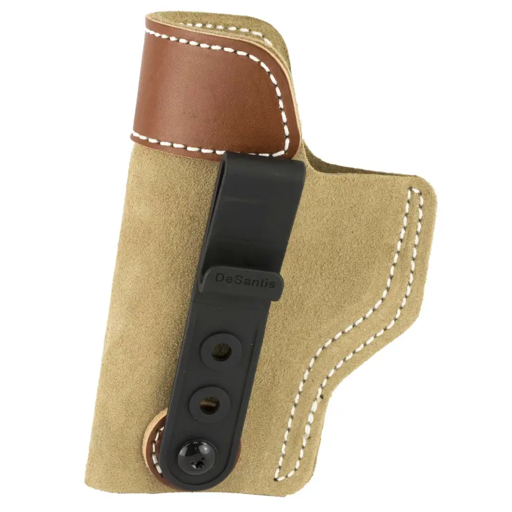 SOF-TUCK is a Desantis inside the waist belt tuckable holster with adjustable cant. It can be worn strong side, cross draw, or on the small of the back. It is built from soft, no-slip suede and reinforced at the top with premium saddle leather to aid in re-holstering.