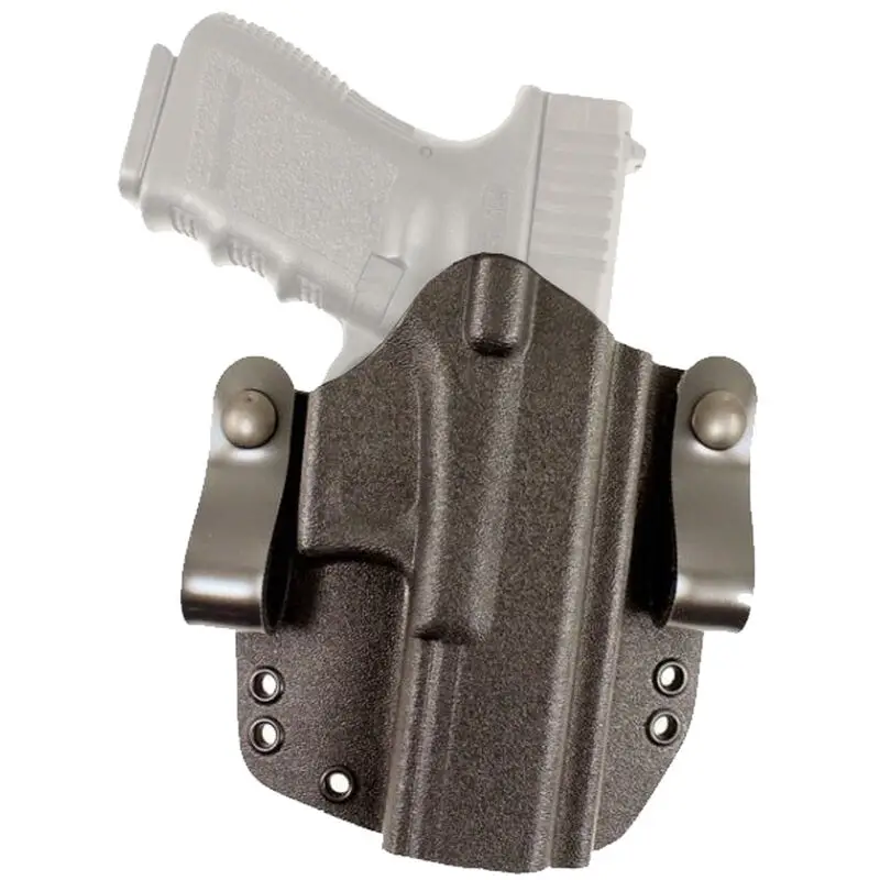 The Raptor gun holster can fit a Glock 19 and features a Kydex thermoformed holster, and features a trigger guard detent and a rear sweat guard.