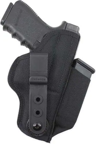 It is built from heavily padded 1050D black Ballistic nylon and lined with slick pack cloth. The widely adjustable belt tab can swing from cross draw to FBI-strong side carry. The tab allows the shirt to be tucked down in between the gun and trousers affording nearly total concealment. Auto-loader versions of the Tuck-This II will have a magazine pouch built into the front holster spine.