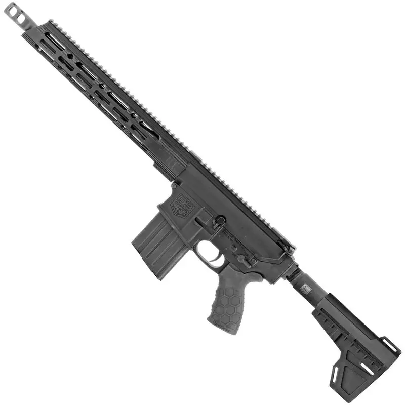 Diamondback's DB10 AR Pistol features a mid-Length gas system and an azimuth black nitride, AR-10 carrier with multi-cal bolt, DPMS style barrel extension, and a high pressure firing pin. It also has a 4150 black nitride barrel with a DB muzzle brake and 5/8x24 threads. The DB10 AR pistol also has a forged 7075-T6 aluminum lower along with a flattop T-marked upper and 13" M-Lok rail, ambidextrous safety, Shockwave blade stabilizer, and a Hexmag grip. This model has a black hardcoat anodized metal finish.