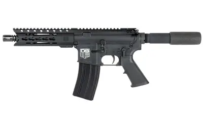 Diamondback Firearms' DB15 Pistol is made entirely in the USA. It uses a gas-impingement system and high quality CNC machined components. The DB15 AR Pistol features a melonite coated, 4140 chrome-moly barrel, forged 7075 T6 aluminum lower along with an A3 flattop upper receiver, no sights, and a carbine length gas system. This model has an 7.5" barrel, buffer tube, A2 pistol grip, and an aluminum modified 4-rail handguard with a black hardcoat anodized finish.