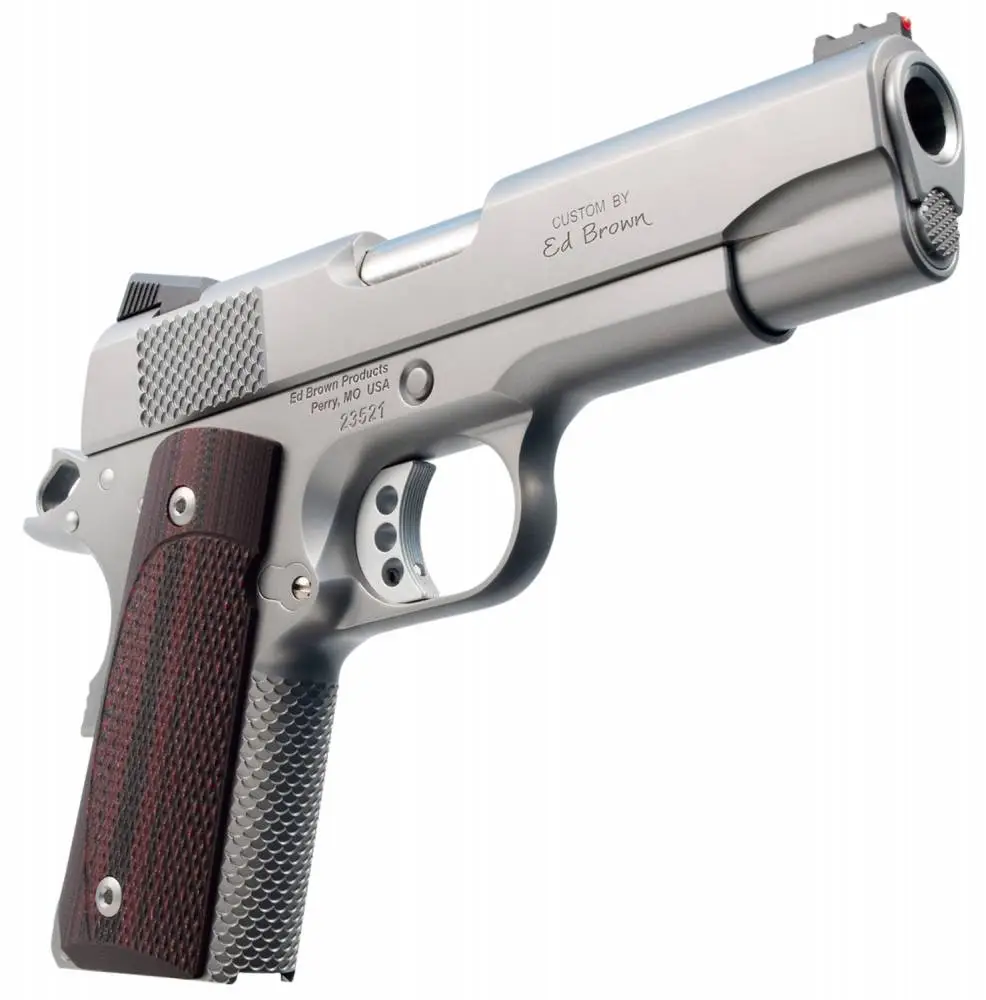 Ed Brown's CCO was designed with concealability in mind and is ideal for carry. Built with fully machined parts by our their skilled pistolsmiths, the CCO begins with a compact (Officer's) size frame, combined with a round butt housing, and concealed carry beavertail grip safety. The 4.25" Commander slide maintains a longer sight radius and allows for maximum reliability. It has a fixed black rear sight mated with a high visibility red fiber optic front sight. The CCO features a Snakeskin metal treatment on the frontstrap, mainspring housing and rear slide. It is less aggressive than checkering while still providing a secure grip. This model has a matte stainless steel metal finish and a 7-round capacity.