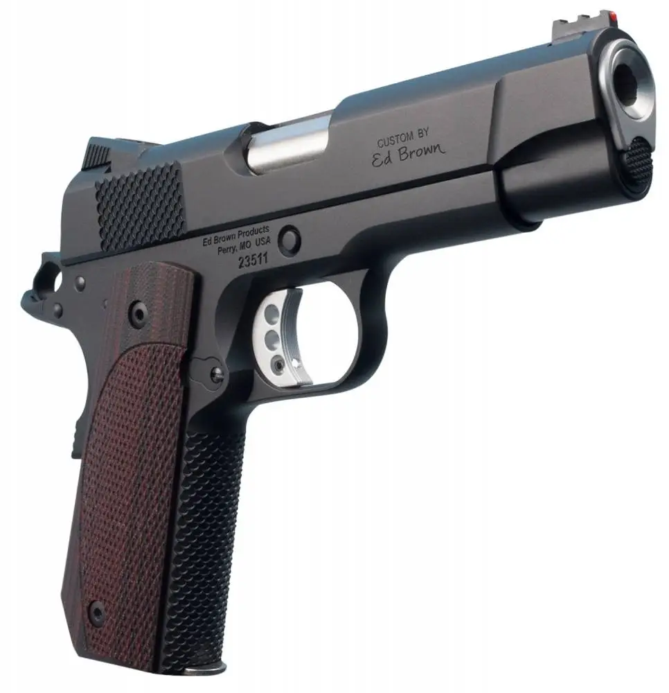Ed Brown's Kobra Carry is built with a 4.25" commander model slide and a single stack commander frame with the Ed Brown Bobtail housing. Unique to the Kobra pistol series is the innovative directional Snakeskin treatment on forestrap, Bobtail housing, and slide. This pattern is smooth to slide your hand up, but bites in for a snug grip the other way where you need it. Kobra Carry has a red fiber optic front sight with a fixed, black rear sight. The Kobra Carry Lightweight features a lightweight 7075 aluminum frame and housing, making it a half-pound lighter than the steel version and excellent for a daily carry weapon. It has a steel insert to protect the feedramp, and includes custom features such as: recessed slide stop, flush barrel with recessed crown, heavy chamfer, and carry cuts. This Kobra Carry Lightweight model is has a Black Gen4 metal finish and slim laminate grips.