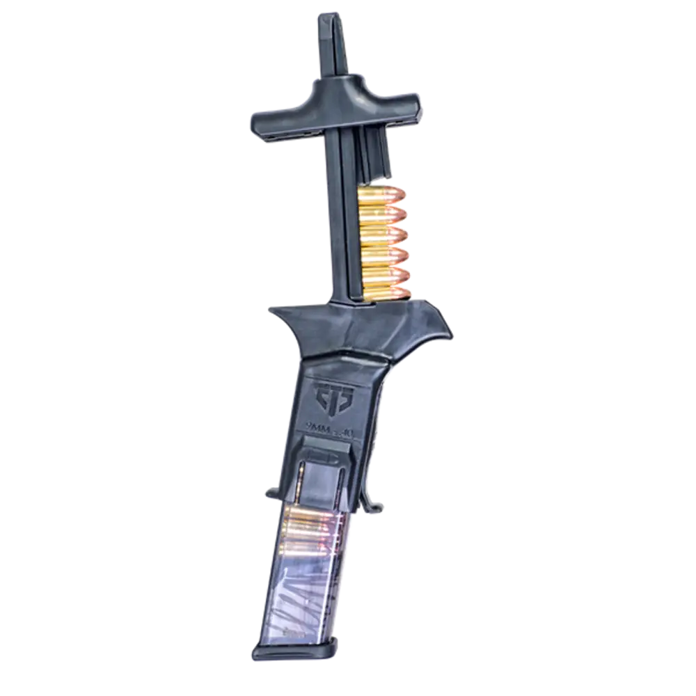 ETS C.A.M Loader loads pistol mags in seconds. It works idealy with 9mm and .40 caliber pistol mags, double or single stack, and also picks up rounds from an ammo tray. The mag loader is constructed of an extremely durable polymer and easily fits in your range bag.