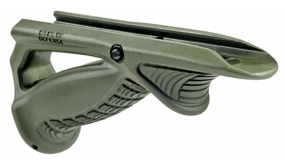 The PTK Ergonomic Pointing Grip conceptualizes within its design a unique combat proven instinctive shooting method incorporating natural pointing positioning for enhanced accuracy, speed and overall performance. Made of a single piece of extremely durable polymer composite, the grip features an additional compartment for cleaning kit or spare battery and is compatible with all 1913 Mil-Std Picatinny rail. This model has an OD green finish.