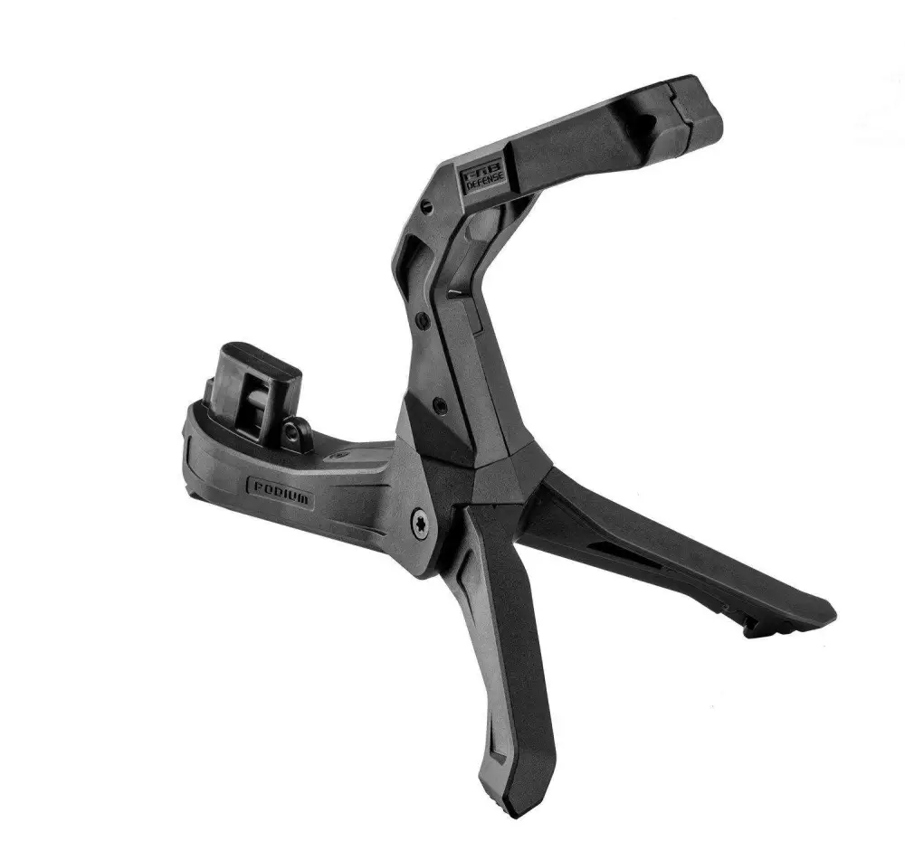 The AR-Podium bi-pod supports the AR-15 enabling the operator to install a steady and durable bi-pod platform without adding front-end weight and saving valuable rail space. The AR-Podium is easily deployed with the main shooting hand, without having to alter the grip on the weapon, or lose sight of the target. Features a compact and sleek design with no protruding parts, rapid deployment mechanism operates by the push of a button and quick and easy installation, no Gunsmith required. Compatible with M-16/AR-15, 5.56 x 45 lower receiver variants, with a standard magazine well.
