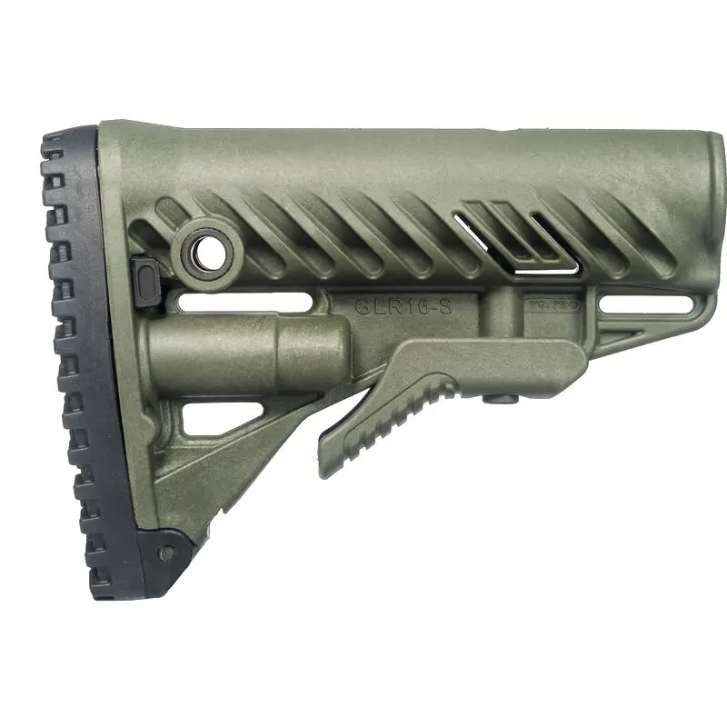 The GLR-16 Buttstock for your AR15/M16 provides you with enhanced versatility with it's stock extension and uniquely designed rubber butt pad for fast and stable shoulder positioning. Its unique patented "Anti-Rattle" mechanism, fits perfectly on MIL-SPEC and commercial after-market buffer tubes. Made from fiberglass reinforced polymer composite, the stock features three integrated slots for sling attachment, one in the front and two at the rear and water-resistant anti rattle storage compartment for two CR123 or AA batteries. This model has an OD green finish.