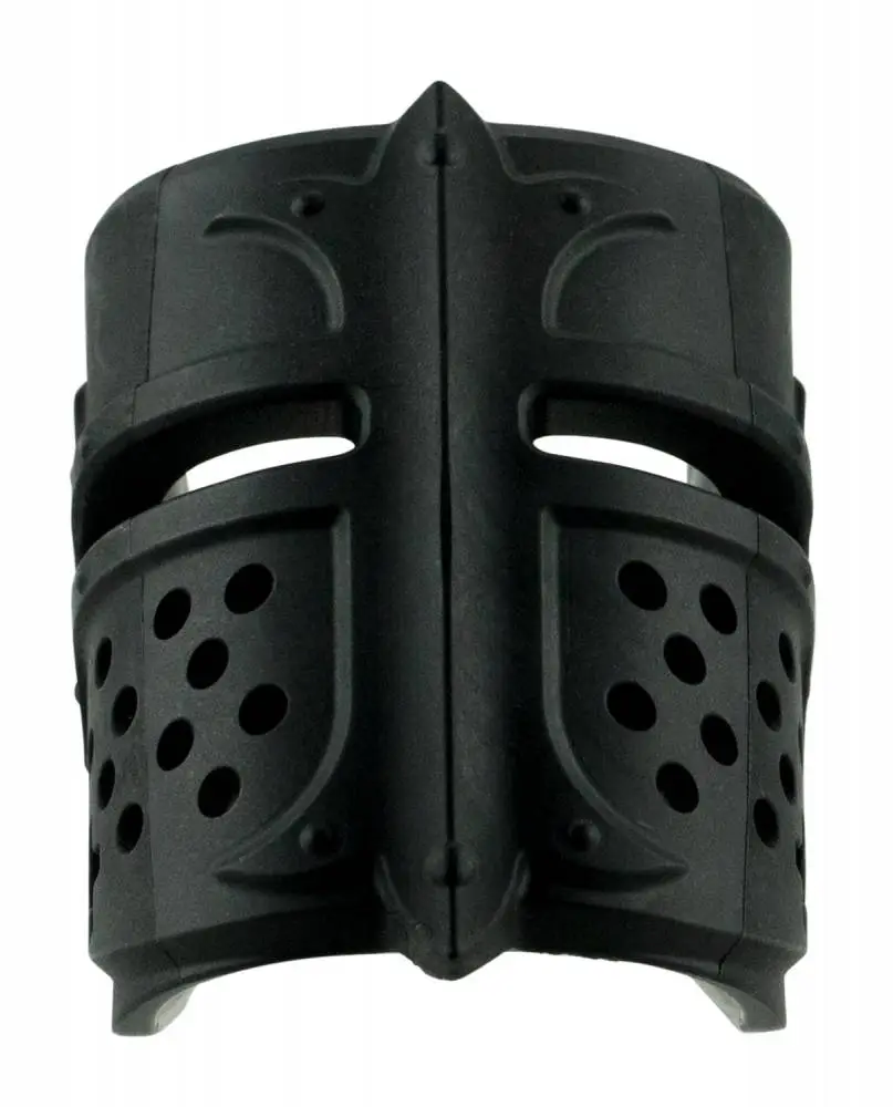 The Mojo is the first product developed with the recreational shooter in mind. It transforms the standard AR Magwell into a comfortable and ergonomic foregrip with a flared and extended magazine well that enhances reload speed, while adding an ornamental aspect to the civilian firearm. The Mojo has a system of easily replaceable grips; the Tactical grip can be used while performing drills on the range, and then quickly replaced with a Mask grip, according to personal preferences. It is constructed of a durable and lightweight fiberglass reinforced polymer and is compatible with M16 5.56x45 lower receiver variants, without a flared magazine well. (May not work well with the PMAG GEN3) This model has a black finish and Crusader mask.
