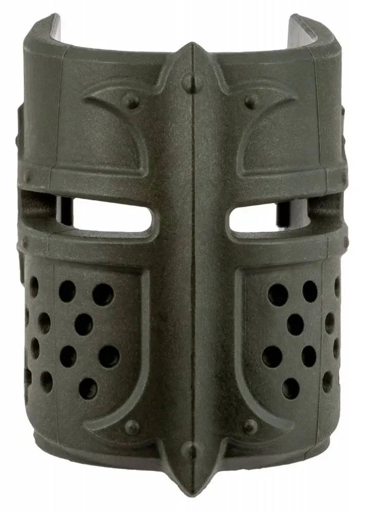 The Mojo is the first product developed with the recreational shooter in mind. It transforms the standard AR Magwell into a comfortable and ergonomic foregrip with a flared and extended magazine well that enhances reload speed, while adding an ornamental aspect to the civilian firearm. The Mojo has a system of easily replaceable grips; the Tactical grip can be used while performing drills on the range, and then quickly replaced with a Mask grip, according to personal preferences. It is constructed of a durable and lightweight fiberglass reinforced polymer and is compatible with M16 5.56x45 lower receiver variants, without a flared magazine well. (May not work well with the PMAG GEN3) This model has an OD green finish and Crusader mask.