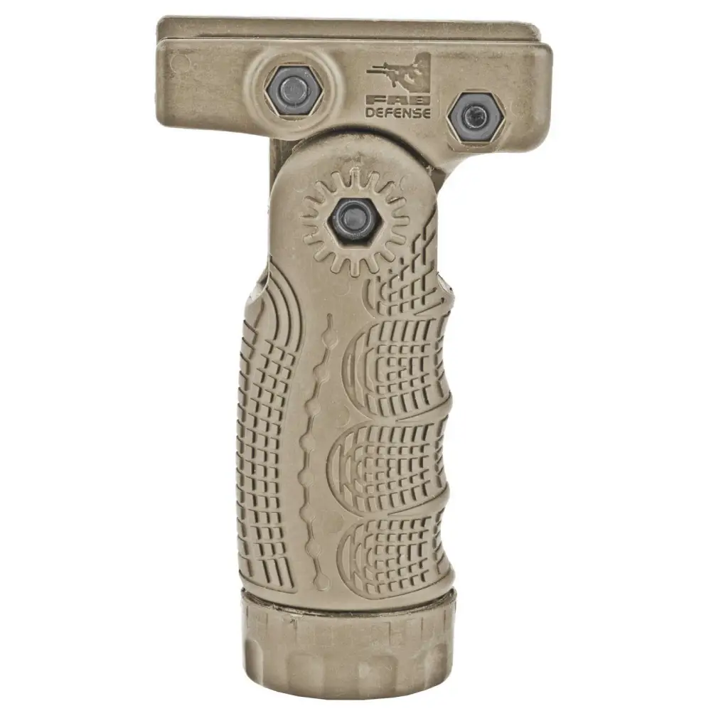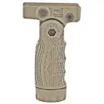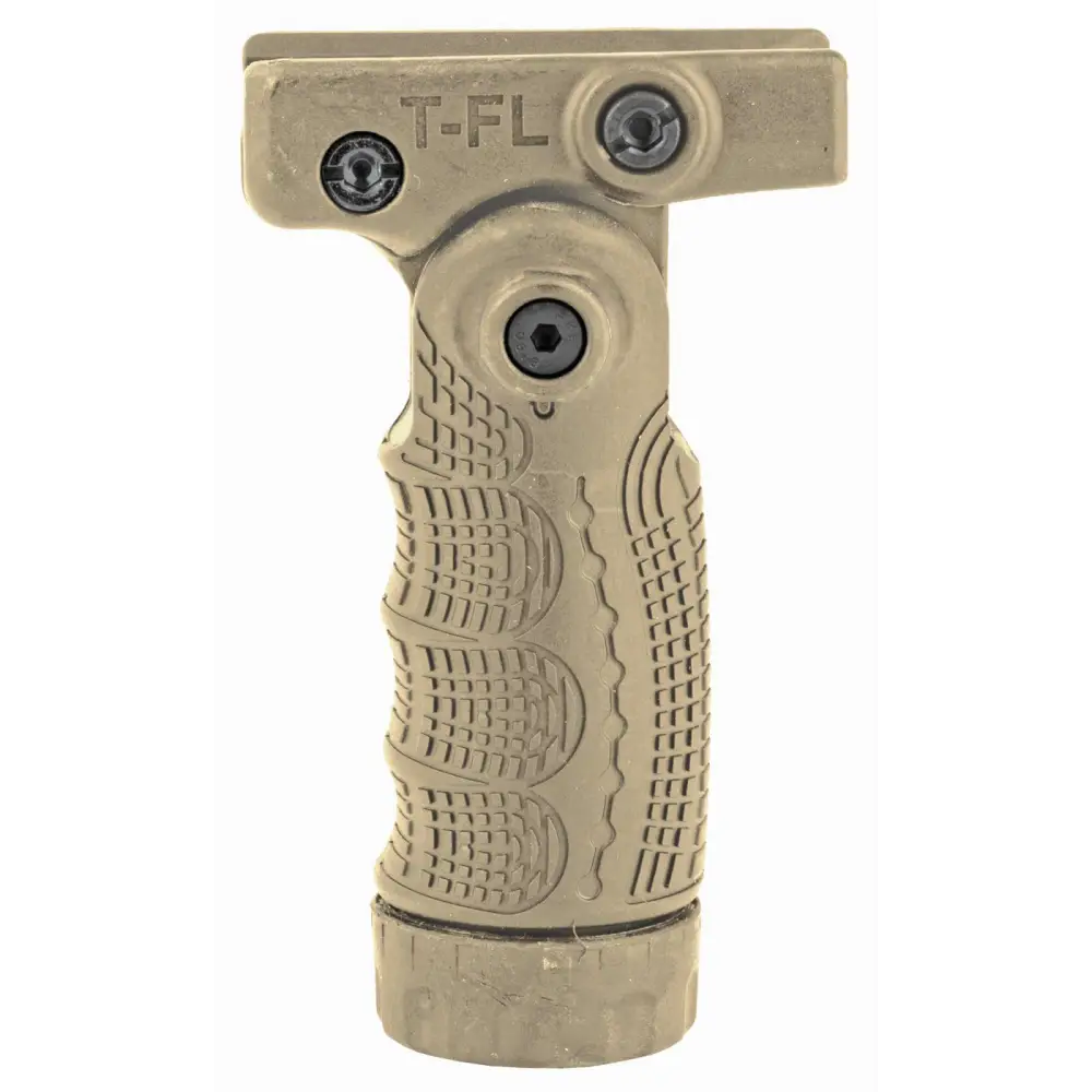 The T-FL 7-Position Vertically Folding Foregrip quickly transforms from a horizontal grip into a vertical grip by the push of a button and provides enhanced versatility, grip and functionality. Easy to fit and secure, the grip slides on the rail and secured with two bolts. It incorporates a convenient waterproof storage compartment, improves reaction, on-target time, and muzzle control during close combat and is constructed of a Mil-Spec fiberglass reinforced polymer composite. This model has a FDE finish.