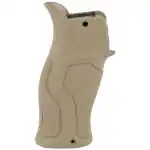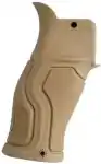 The Gradus pistol grip is an ergonomic rubberized grip that has a relatively straight profile for long range precision shooting and CQB scenarios. It features a reinforced polymer core with textured rubber overmold, 15 degree reduced grip angle, and a slim ergonomic design with a curved back strap for enhanced, more comfortable grip.