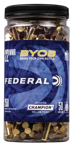 There's a party at the range, so BYOB. Federal BYOB rimfire buckets and bottles are bulk packs that stack, store and carry easily. They're loaded with high-quality 17 HMR, 22 LR or 22 WMR rounds that are perfect for a fun day at the range or in the field. Shooters can remove the packs lids completely or keep them on to use the easy-pour feature.