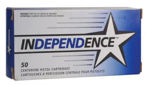 The Independence line of ammunition is manufactured using modern processes and components that yield a quality product ideal for target practice and recreational shooting. It offers consistent performance at a competitive price, and features fully reloadable, newly manufactured brass cases, non corrosive primers and full metal jacket bullets.