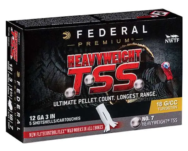 Kill gobblers at longer distances than ever before with HEAVYWEIGHT TSS. Its payloads of HEAVYWEIGHT Tungsten Super Shot provide the highest pellet counts possible. The tungsten-alloy materials 18 gm/cc density is 22 percent higher than standard tungsten and 56 percent more than lead. The result is the most energy and highest velocities at extreme range. Its rear-braking FLITECONTROL FLEX wad performs flawlessly through ported and standard turkey chokes for the most consistent, deadly patterns possible.