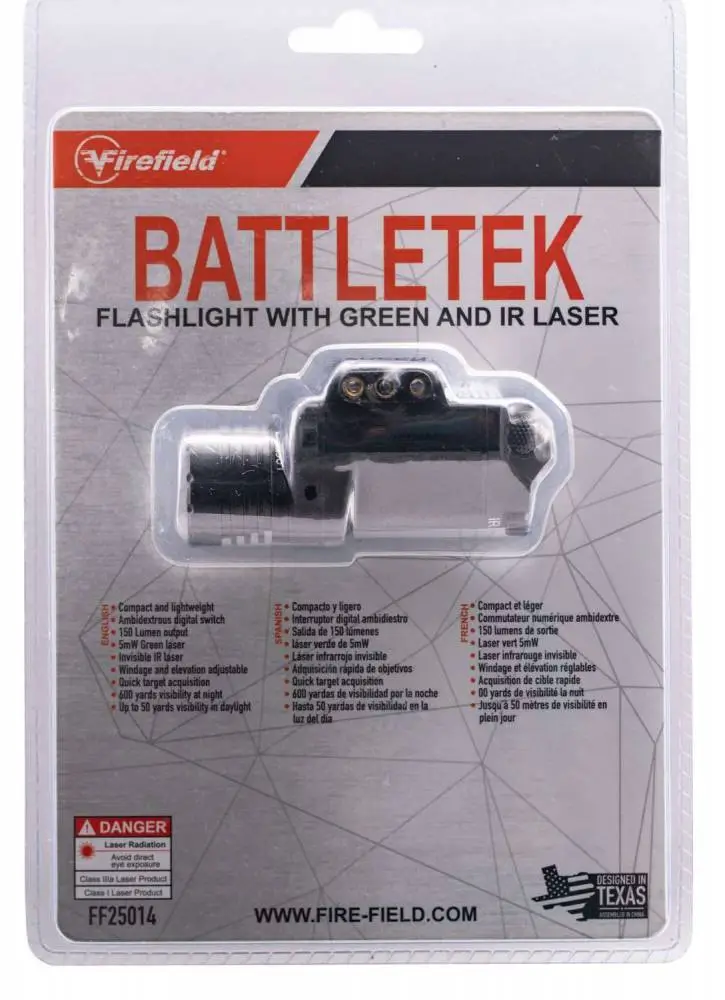 The BattleTek Flashlight w/green and IR laser is the ideal attachment for combat simulation and self defense. The BattleTek combo features an ambidextrous digital switch, 5mw green laser for quick target acquisition, IR laser for night vision use without a night vision optic and a 150 lumen flashlight. The 150 lumen flashlight identifies targets and temporarily disorients intruders. Maximum calibers is .308