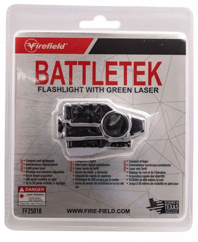 The Firefield BattleTek Flashlight with green laser is ideal for quick target acquisition and combat simulations while in low-light situations. BattleTek sights are compact and crafted out of a lightweight, durable glass filled nylon material and are IP55 rated water resistant, shockproof and able to stand up to a max caliber of .308. Also, features a 150-lumen LED light with a strobe setting and a 5mw green laser, with a range of up to 50 yards of visibility during the day or 600 yards at night.