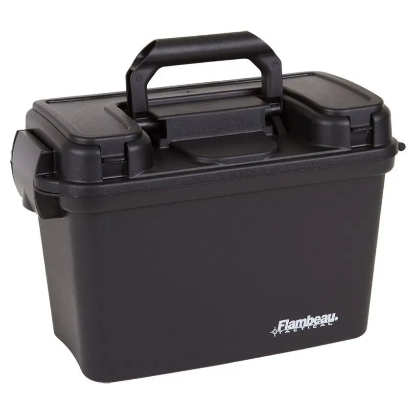 The Tactical Dry Box is made in the U.S.A.. It features a durable polymer construction with a removable tray, flip-top accessory storage compartment, water-resistant gasket, OTC latch, and carry handle. This 14" model has a black finish.