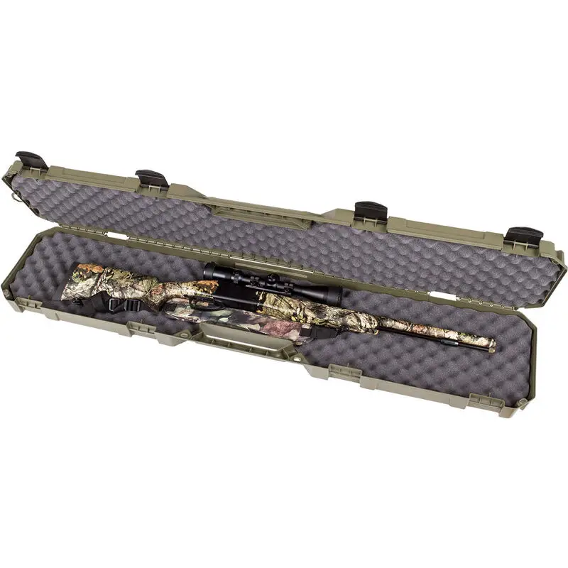 Flambeau's Shot Safe Field Gun Case is constructed of a rugged polymer with convoluted foam set with deep cushioning and piano-style hinges for storage safety when locked. It utilizes four (4) tie-down straps, lock hasps, and latches. This model has a tan finish and is compatible with one (1) scoped rifle or shotgun. It has interior dimensions of 49.75" L x 9.8" W x 3" D.