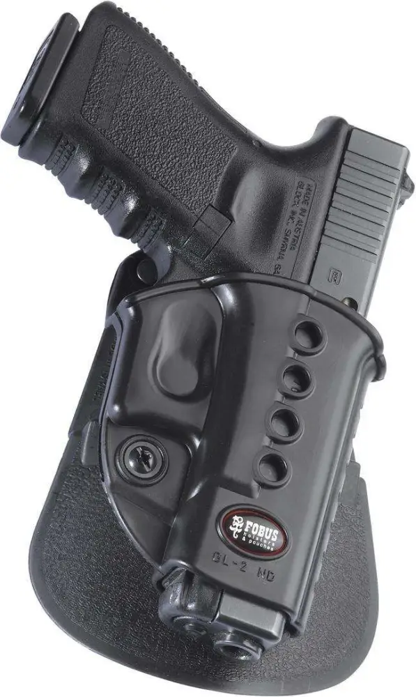 The Evolution series is the next step in the advancement of holster development. A tension adjustment screw is incorporated to allow the user to customize the ease of presentation and the security of retention, functioning with the proven Fobus passive retention design. The E2 series features one piece holster body construction, and like all Fobus holsters, the Evolution, is lightweight and includes steel reinforced rivet attachment and a protective sight channel. The paddle also includes a rubberized insert to provide both comfort and stability.